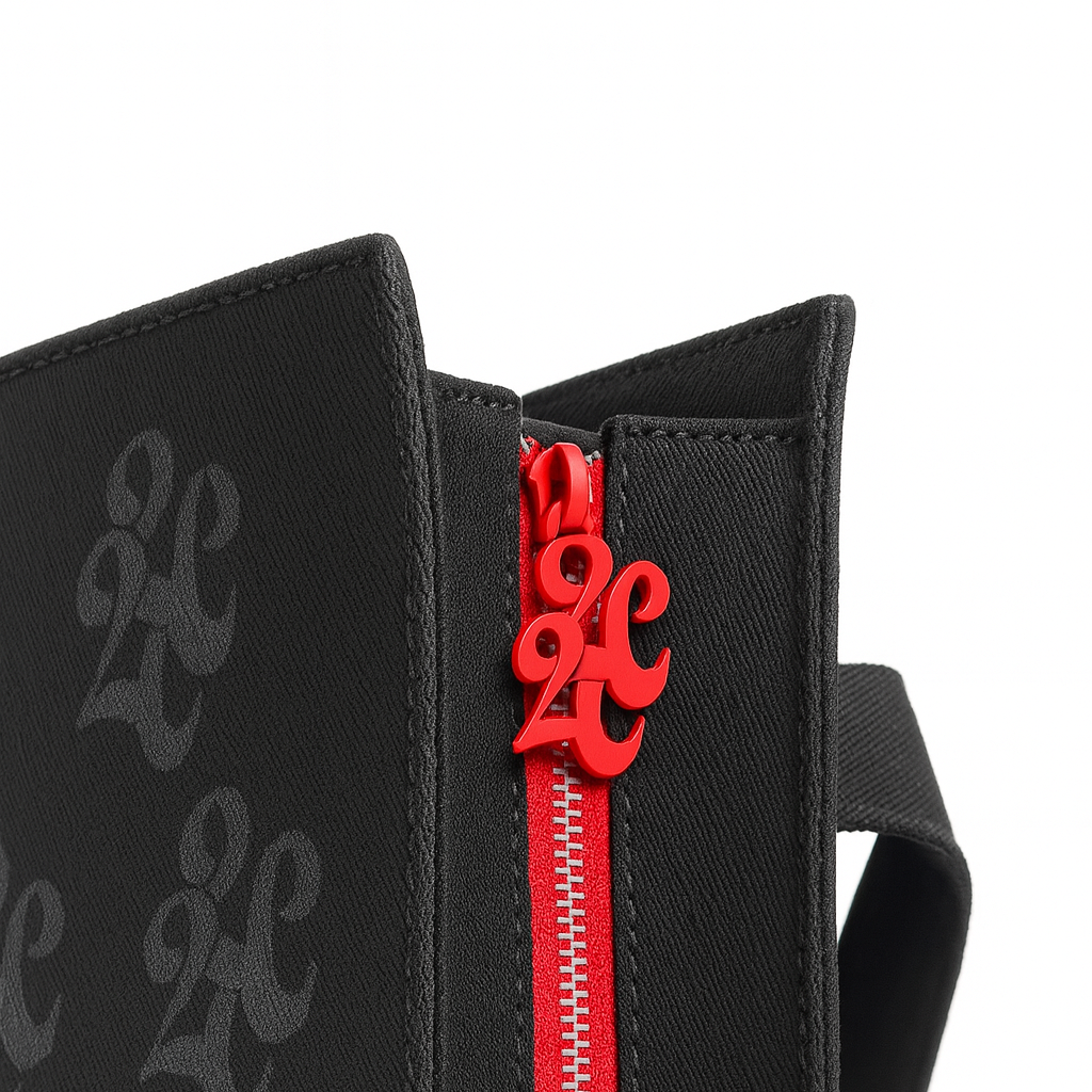 Details: Reinforced stitching throughout. Logo zipper pulls. Metal studs protect the base. Belt loop detail on the strap for carry options. Suede-lined interior. Removable shoulder strap. Signature rubber label. Laser-engraved all-over logo print across the exterior.